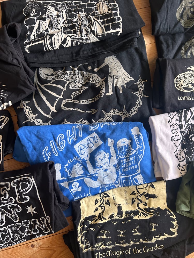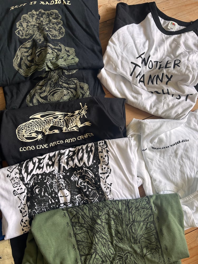 various garments that have been used as practice in my screenprinting process that are still wearable. Buying one of these helps reduce waste, and all proceeds go directly into helping me buy better tools and supplies to progress ! Im trying to be as earth friendly as possible in my practice so this helps me alot !